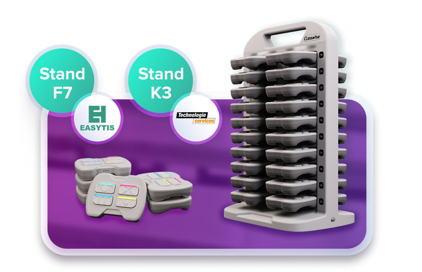 Classwise affiche du contenu et des quiz sur un tableau blanc interactif ou un projecteur. Chaque élève utilise une manette, également appelée Classpad, pour interagir avec le contenu et répondre aux questions. L’enseignant peut voir des synthèses en temps réel, suivre la progression des élèves et piloter des activités interactives pour maintenir leur concentration.